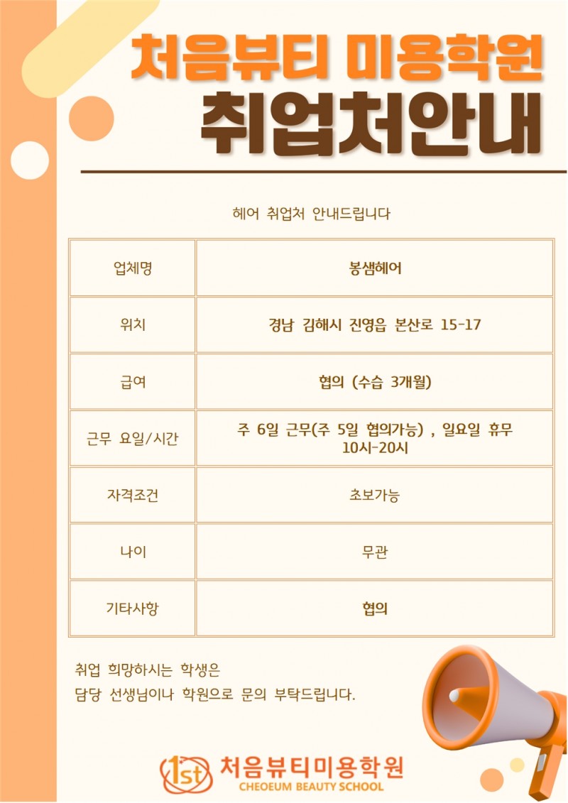 오늘은 처음뷰티미용학원에서 연결 가능한 구인구직 안내해 드리겠습니다~~