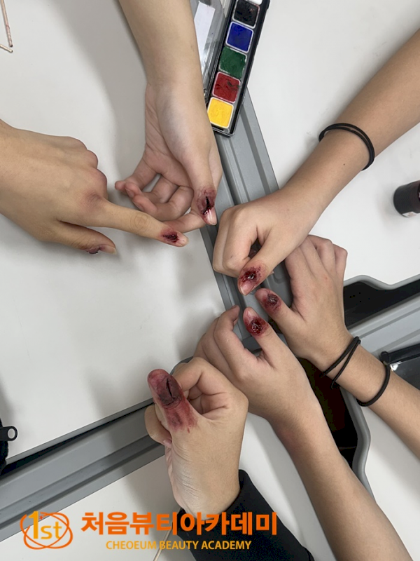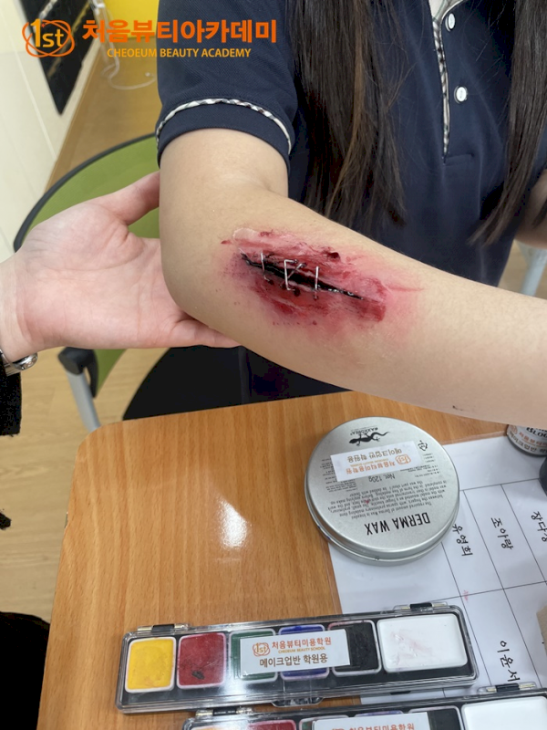 확인하는 모습이에요~~ 각자 스타일대로 개성 있는 상처 표현이 나와서 교실이 작은 특수분장