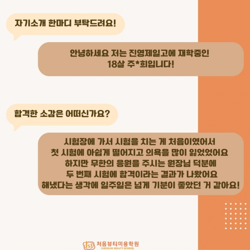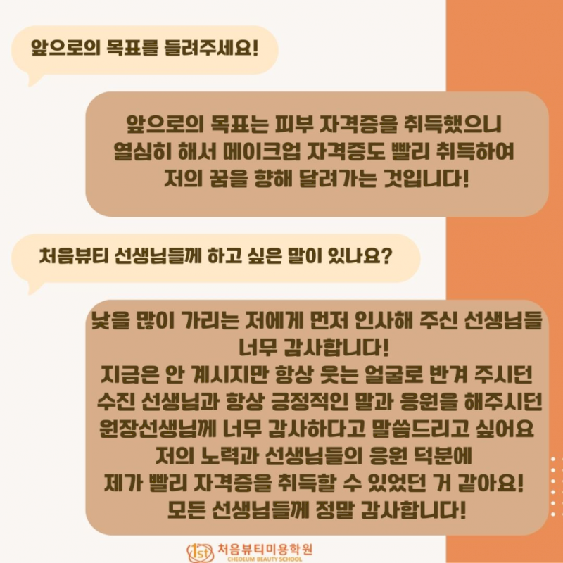처음뷰티미용학원 "피부미용 국가자격증" 합격자 인터뷰!!! > 수강생 갤러리