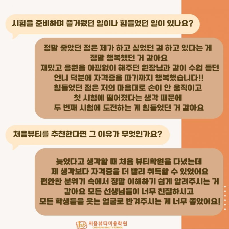 처음뷰티미용학원 "피부미용 국가자격증" 합격자 인터뷰!!! > 수강생 갤러리